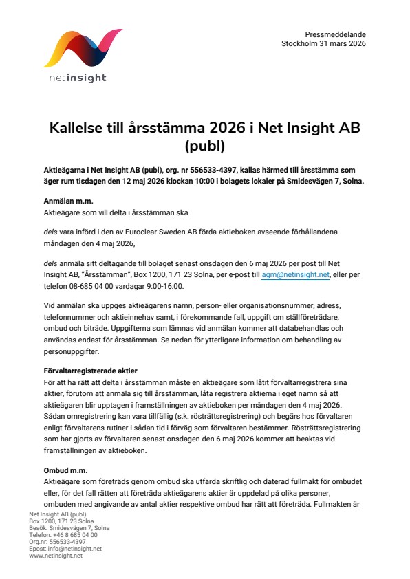 Årsredovisningen för räkenskapsåret 2025, revisionsberättelsen, styrelsens ersättningsrapport och revisorns yttrande huruvida styrelsens riktlinjer för ersättning till ledande befattningshavare har följts, samt fullständiga förslag och handlingar enligt aktiebolagslagen kommer att hållas tillgängliga på bolagets huvudkontor på Smidesvägen 7, 171 23 Solna, och på bolagets webbplats www.netinsight.net senast tre veckor innan årsstämman. Handlingarna sänds även till aktieägare som så begär och uppger sin postadress.