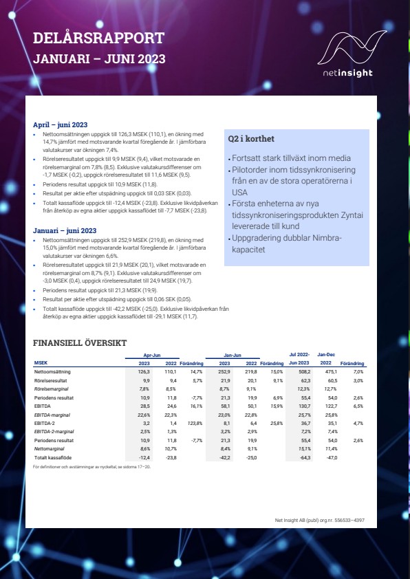 Net Insight Delårsrapport Januari – juni 2023