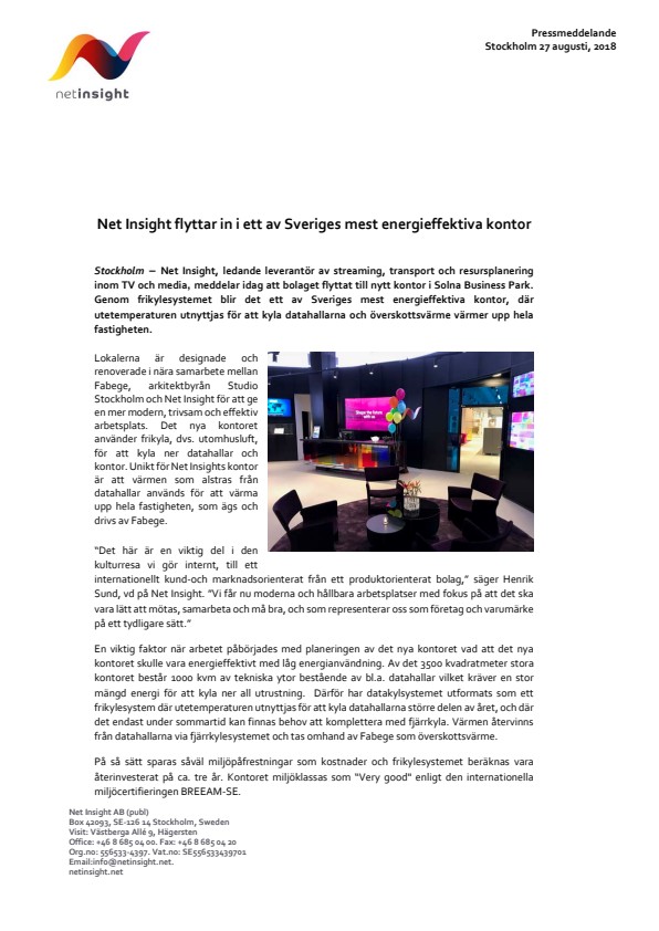 Stockholm –Net Insight, ledande leverantör av streaming, transport och resursplanering inom TV och media,meddelar idag att bolaget flyttat till nytt kontor i Solna Business Park. Genom frikylesystemet blir det ett av Sveriges mest energieffektiva kontor, där utetemperaturen utnyttjas för att kyla datahallarna och överskottsvärme värmer upp hela fastigheten.