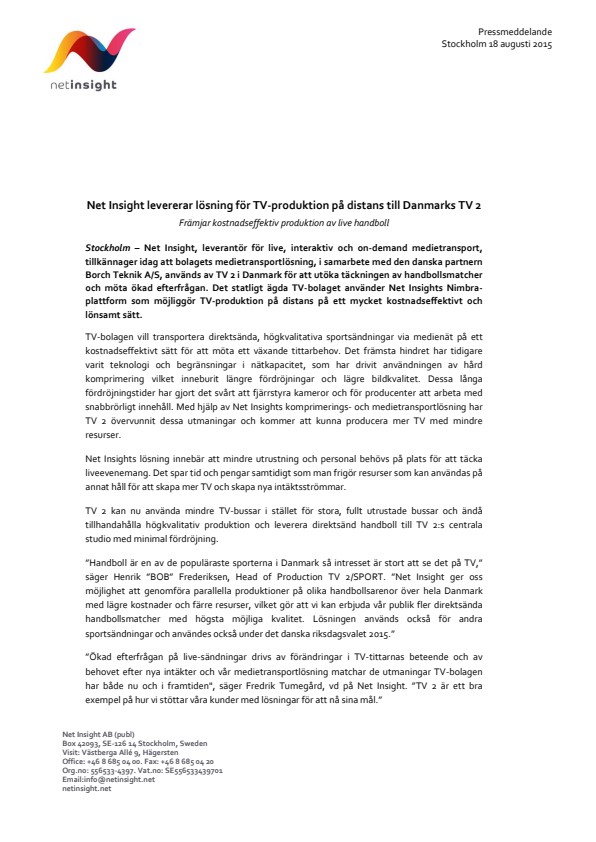 Stockholm– Net Insight, leverantör för live, interaktiv och on-demand medietransport, tillkännager idag att bolagets medietransportlösning, i samarbete med den danska partnern Borch Teknik A/S, används av TV 2 i Danmark för att utöka täckningen av handbollsmatcher och möta ökad efterfrågan. Det statligt ägda TV-bolaget använder Net Insights Nimbra-plattform som möjliggör TV-produktion på distans på ett mycket kostnadseffektivt och lönsamt sätt.