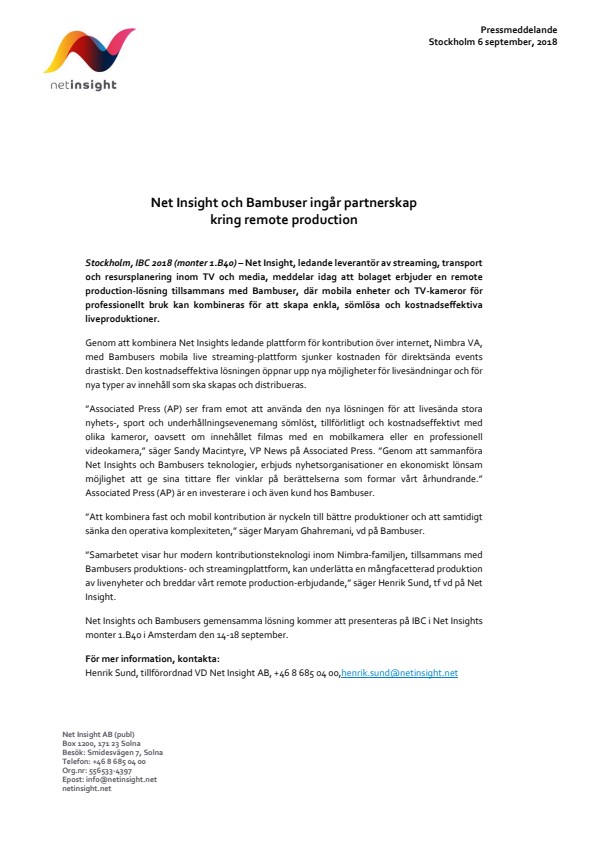 "Samarbetet visar hur modern kontributionsteknologi inom Nimbra-familjen, tillsammans med Bambusers produktions- och streamingplattform, kan underlätta en mångfacetterad produktion av livenyheter och breddar vårt remote production-erbjudande," säger Henrik Sund, tf vd på Net Insight.
