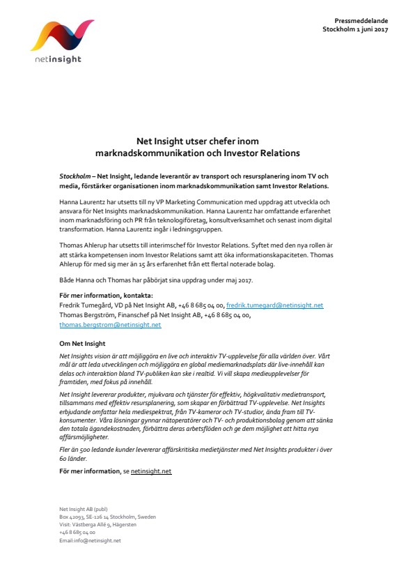 Stockholm– Net Insight,ledande leverantör av transport och resursplanering inom TV och media, förstärker organisationen inom marknadskommunikation samt Investor Relations.
