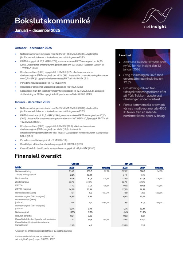 Som tidigare kommunicerats var 2025 var ett utmanande år för Net Insight med en svag avslutning. Omsättningen påverkades negativt av valutamotvind, en osäker makroekonomisk omvärld samt längre säljprocesser för tidssynkroniseringsaffären. Samtidigt behöver vi stärka vår säljeffektivitet och fortsätta utveckla vårt erbjudande. Vår nya 400G-mediaplattform, där vi vunnit vår första order, är ett viktigt exempel på vidareutvecklingen av portföljen.