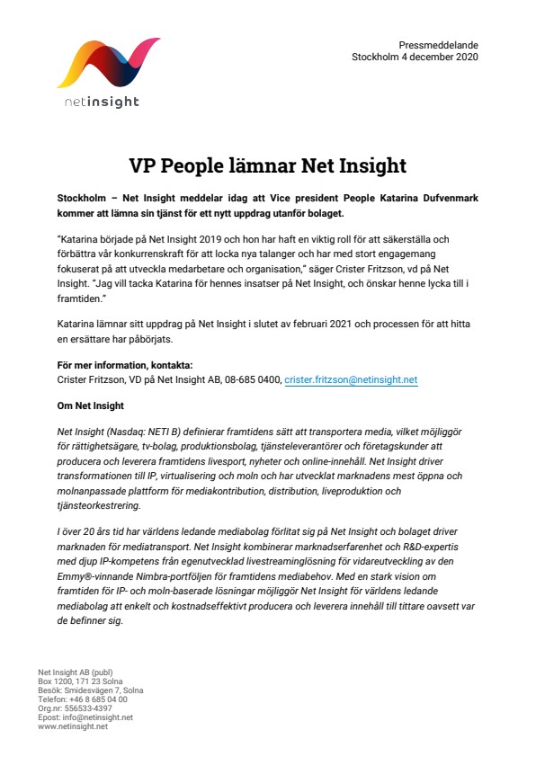 Stockholm – Net Insight meddelar idag att Vice president People Katarina Dufvenmark kommer att lämna sin tjänst för ett nytt uppdrag utanför bolaget.